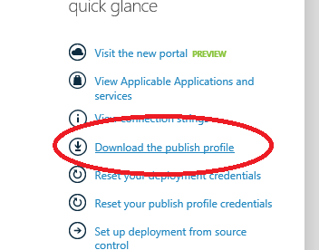 After the web application has created, go into the dashboard for it and on the right hand side, you should choose the download the publish profile option to download the publish profile to your local machine.